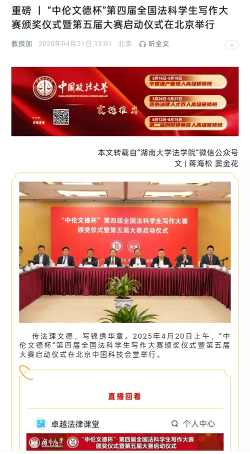 传法理文德,写锦绣华章。2025年4月20日上午,“中伦文德杯”第四届全国法科学生写作大赛颁奖仪式暨第五届大赛启动仪式在北京中国科技会堂举行。 “全国法科学生写作大赛”由大赛组委会主办、湖南大学法学院发起并承办,首届大赛于2019年8月启动,每年举办一届。比赛旨在推进法学教育改革,提升法律写作水平,培育时代英才。四届大赛中,共有3900多篇文章参赛,4000多名学子竞秀争雄。全国几十家媒体进行了上百次密集报道,并入选法学教育十大年度新闻。