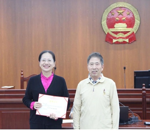 (捐赠人李德文、法学院党委副书记胡琼为学生颁奖)