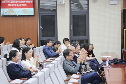 湖南大学法学院副院长王文胜教授宣读获奖名单,他指出,根据《湖南大学法学院刘定华法学教育发展基金管理办法》,经湖南大学法学院刘定华法学教育发展基金管理委员会评议,决定授予陈锦红老师“湖南大学法学院刘定华爱岗敬业奖”,授予宋晓庆老师、张红老师“湖南大学法学院刘定华优秀教学奖”;张骋、李轶楠、陈楷林、向丹、刘玉、钟晓华、孙源、谢雨欣、蒋欣苡、关学安十位同学荣获“刘定华奖学金”。颁奖仪式在热烈的掌声中进行,获奖老师和同学们一一上台接受荣誉证书。