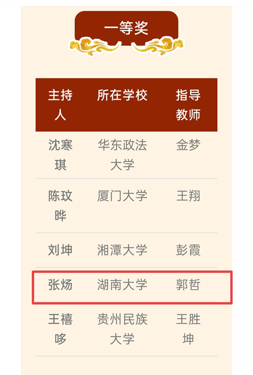 我院参赛队伍由郭哲教授担任指导老师,由2023级本科生张炀担任负责人,成员包括2023级本科生甘欣平、何雪、胡稼慧、杨斐冉、张莹慧、邹艳萍。在历时数月的备赛过程中,全体成员充分发挥主动性和创造性,高质量完成了实证研究、资料梳理与条文起草等各项工作。她们立足湖南省情,系统梳理本土诉求,以问题为导向精心起草了《湖南省实施〈中华人民共和国民营经济促进法〉规定(草案)》,构建了富有湖湘特色的地方立法方案。