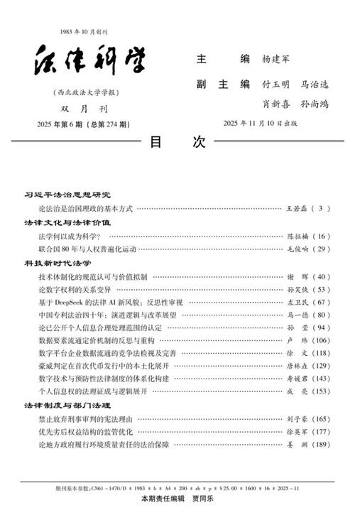近日,湖南大学法学院成亮老师在《法律科学》2025年第6期发表论文《个人信息权的法理证成与逻辑展开》。
