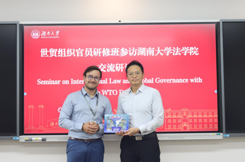 湖南大学法学院院长黎四奇向研修班全体学员表示欢迎,并就湖南大学法学院、湖南大学法学院国际法课程设置、涉外法治人才培养模式的情况进行简要介绍。他说:“非常高兴能与各位相聚在湖南长沙,会面于湖南大学这座千年学府中。湖南大学法学院是中国近现代法学教育中历史底蕴最为厚重的法学院系之一,其学脉上溯至1897年的时务学堂。开设了“公法学”等较为系统的法政教育课程。这被追溯为湖南大学法科的源头之一,也是近代中国法学教育的源头之一。各位是发展中国家在世贸组织中的杰出代表,我们希望通过此次交流研讨,跟大家分享湖南大学法学院师生在涉外法治建设方面的实践经验,并通过这样一个互学互鉴、交流对话的平台,共同拓展我们的国际交流合作,为涉外法治教育发展注入新的活力。”