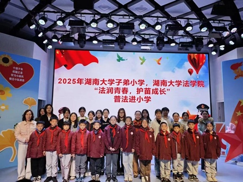 2025年12月2日,临近国家宪法日之际,为提升小学生的法律意识,湖南大学法学院与湖南大学子弟小学联合开展了以“法润青春,护苗成长”为主题的校园普法活动。湖南大学子弟小学的领导、老师和同学及湖南大学法学院部门工作人员、青年志愿者协会志愿者参加活动。本次活动分为“预防未成年人犯罪普法小课堂”、“‘以案释法’情景演绎小剧场”以及“收获分享”三个环节,由湖南大学法学院团委实践部程宸同学主持。