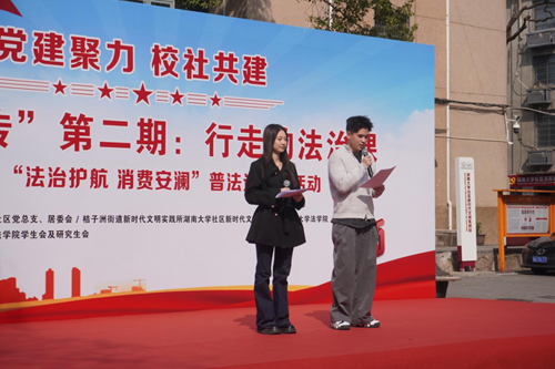 社区作为社会治理的基本单元,是普法工作的关键阵地,也是提升全民法治素养的“最后一公里”。为了推进基层社区普法工作,湖大社区特此联合湖南大学法学院开展“3·15”消费者权益保护日系列活动之党建聚力·区校共建|“法治护航,消费安澜”普法进社区活动。