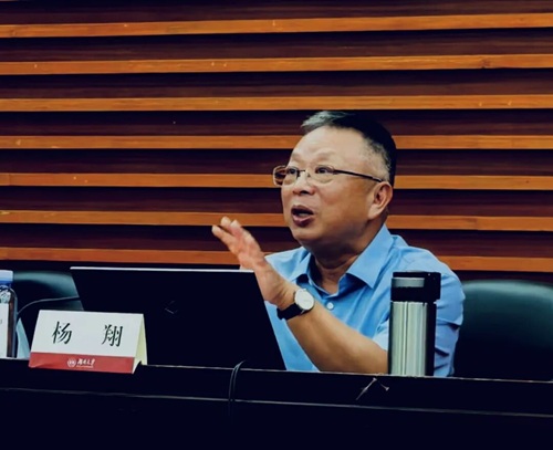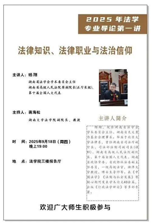 2025年9月18日晚,现任湖南省法学会学术委员会主任、湖南省见义勇为基金会理事长杨翔教授在湖南大学法学院报告厅,为2025级新生带来主题为“法律知识、法律职业与法治信仰”的法学专业导论第一讲。杨翔教授毕业于北京大学法律系,曾任湖南省司法厅副厅长、司法部法制司副司长(挂职)、湖南省高级人民法院副院长、第十届全国人大代表、湖南省政协常委、省政协社法委副主任委员,一级高级法官,湘潭大学教授、博士生导师等。在《中国法学》《法制与社会发展》等核心期刊发表学术论文40余篇,出版《行政法学新论》等多部专著。本次入学导论由法学院副院长蒋海松老师主持,法学院本科新生到场聆听,现场气氛热烈。