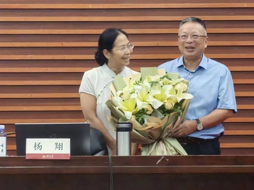 而后,曾经作为杨教授学生的马青波老师向杨教授献上鲜花,往昔师生有幸再度同框,同学们感触颇深,现场掌声不绝,讲座由此圆满结束。